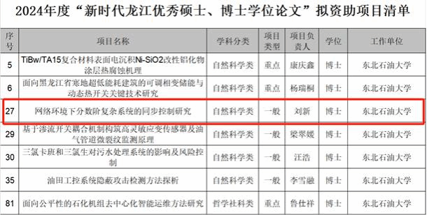(通讯员 王美娜)近日,黑龙江省教育厅正式公示了2024年度"新时代龙江优秀硕士、博士学位论文"拟资助项目名单。经严格评审,米乐mile官网7位学者脱颖而出获得资助,其中米乐mile官网刘新老师的博士论文《网络环境下分数阶复杂系统的同步控制研究》成功获批自然科学类一般项目资助。